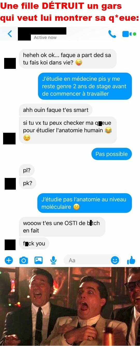 Blagues QuébécoisesUne Fille DÉTRUIT Un Gars Qui Veut Lui Montrer Sa Q*eue 👇 FAIS RIRE QUELQU'UN Facebook 73 Messenger WhatsApp Pinterest0