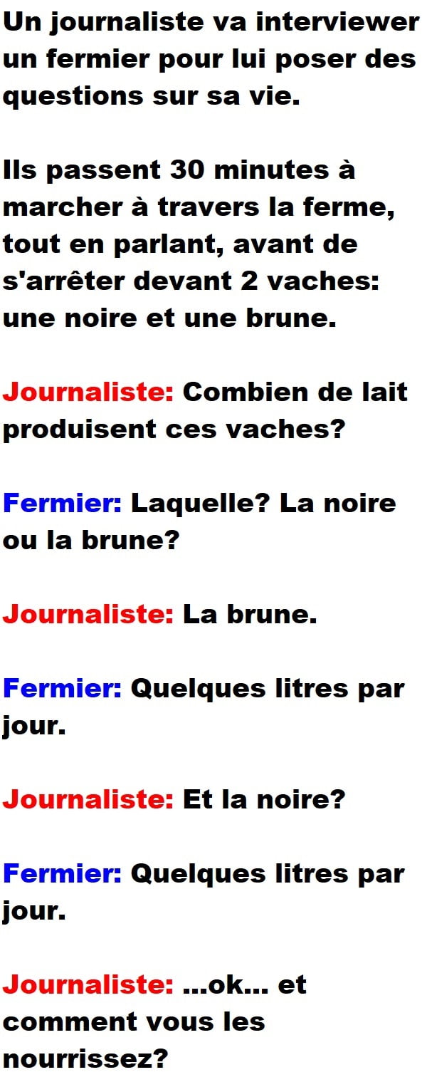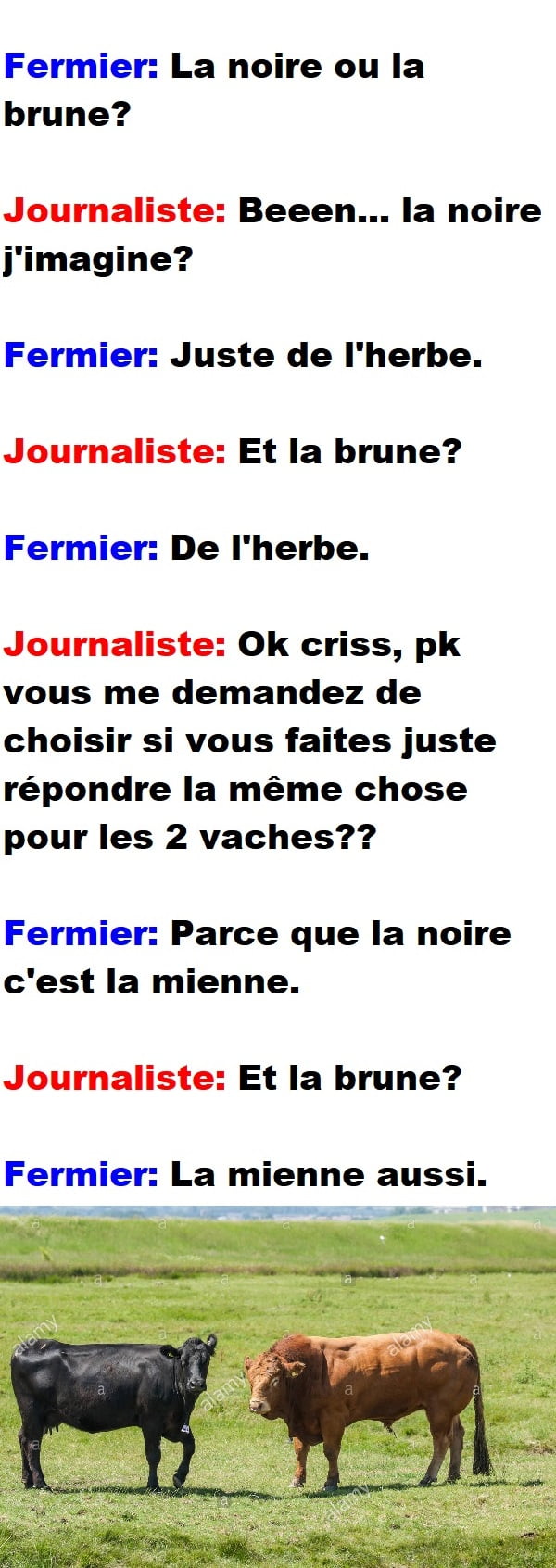 Blagues QuébécoisesUn journaliste interview un fermier à propos de 2 vaches 👇 FAIS RIRE QUELQU'UN Facebook 32 Messenger WhatsApp Pinterest0