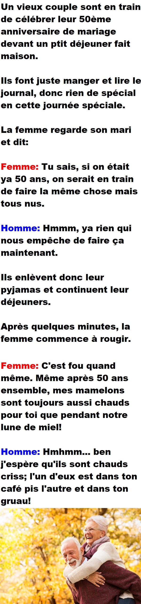 Blagues QuébécoisesUn vieux couple célèbre leur 50ème anniversaire 👇 FAIS RIRE QUELQU'UN Facebook 5 Messenger WhatsApp Pinterest0