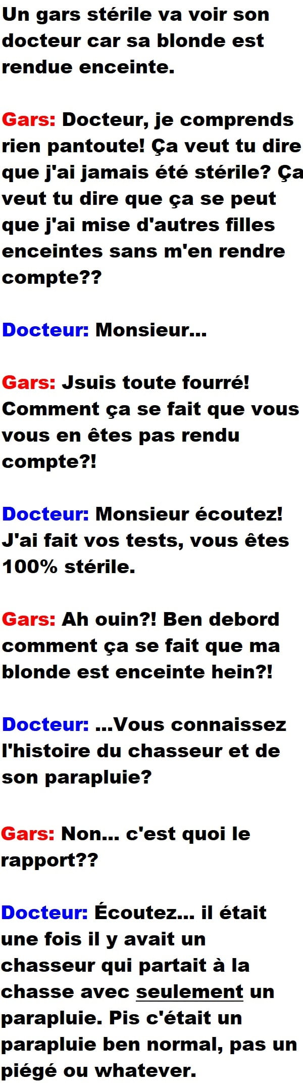 Home / Blagues Québécoises / Un gars stérile va voir son docteur car sa blonde est enceinte