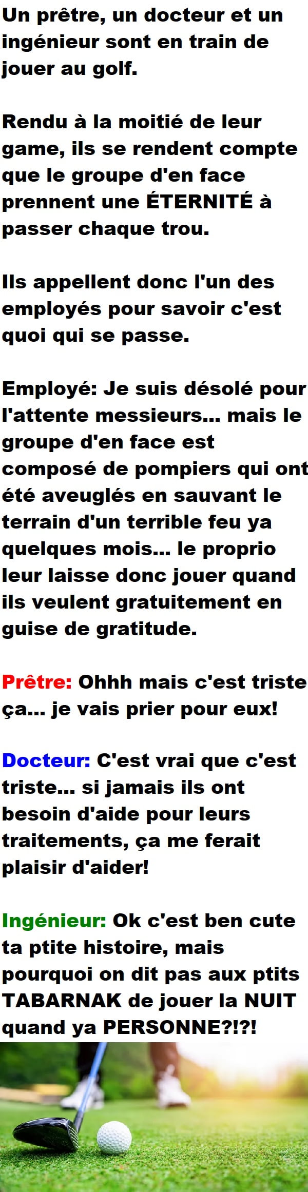 Home / Blagues Québécoises / Un prêtre, un docteur et un ingénieur sont tannés d’attendre pour jouer au golf