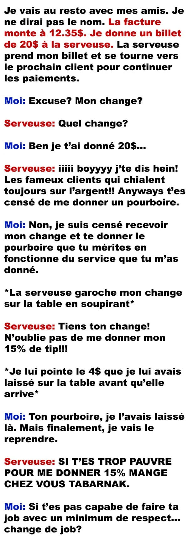 La serveuse qui voulait pas me redonner mon change