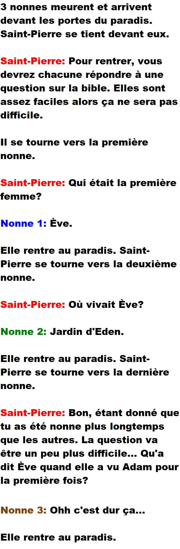 Blagues Québécoises3 nonnes doivent répondre à des questions pour rentrer au Paradis 👇 FAIS RIRE QUELQU'UN Facebook 15 Messenger WhatsApp Pinterest0