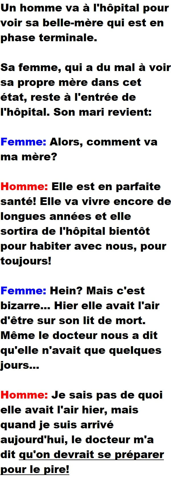 Blagues QuébécoisesUn homme va visiter sa belle-mère qui est en phase terminale 👇 FAIS RIRE QUELQU'UN Facebook 8 Messenger WhatsApp Pinterest0