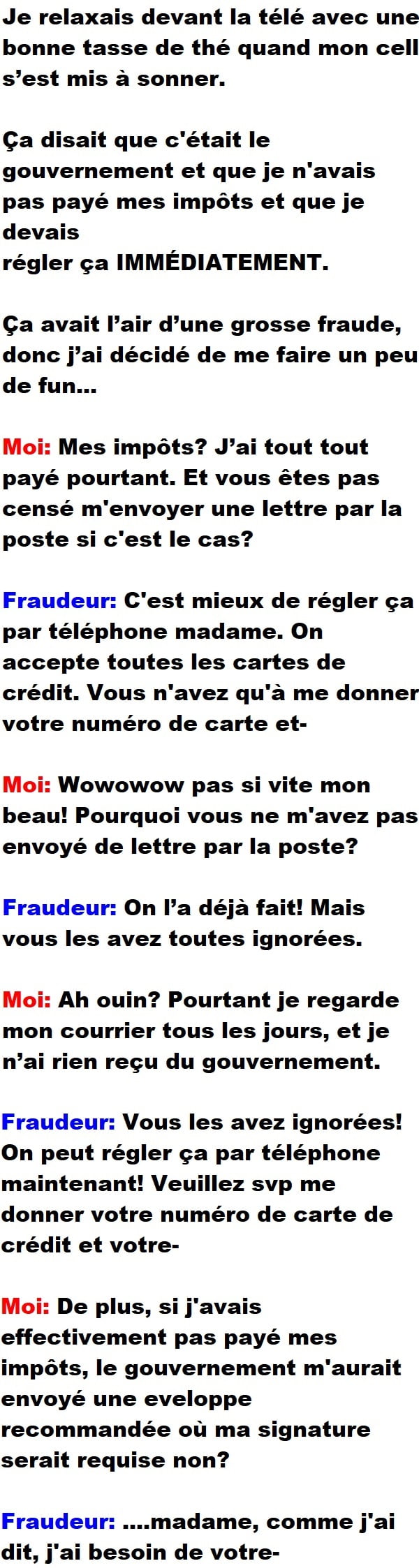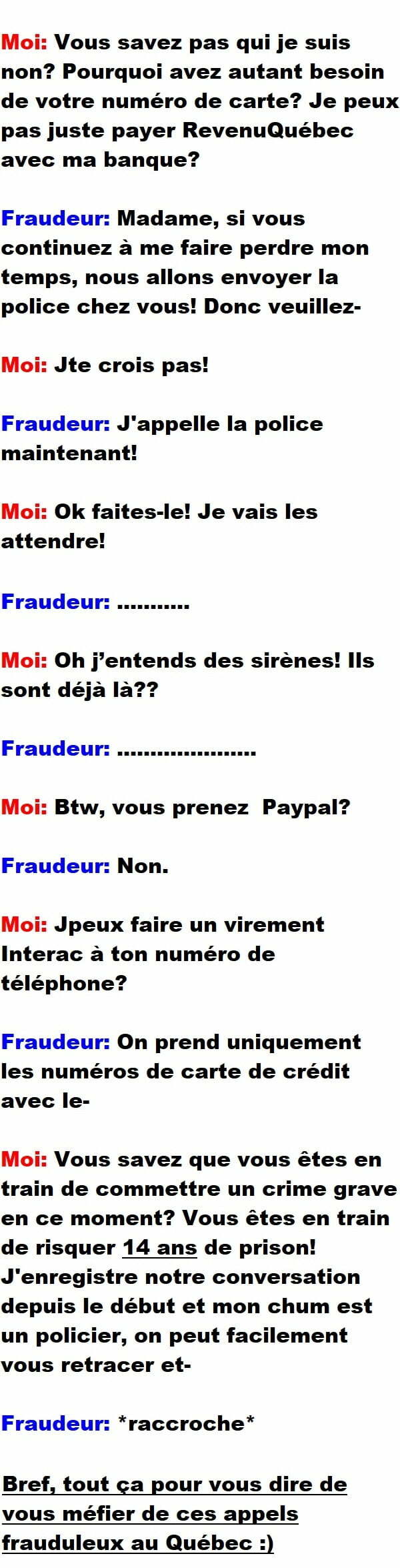 Blagues QuébécoisesL’appel que j’ai eu avec un fraudeur au téléphone 👇 FAIS RIRE QUELQU'UN Facebook 16 Messenger WhatsApp Pinterest0