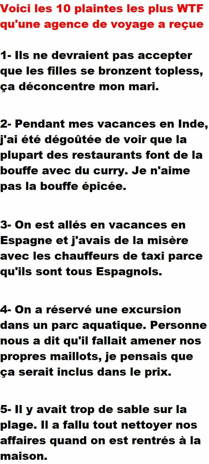 Blagues QuébécoisesVoici les 10 plaintes les plus WTF qu’une agence de voyage a reçue👇 FAIS RIRE QUELQU'UN Facebook 32 Messenger WhatsApp Pinterest0