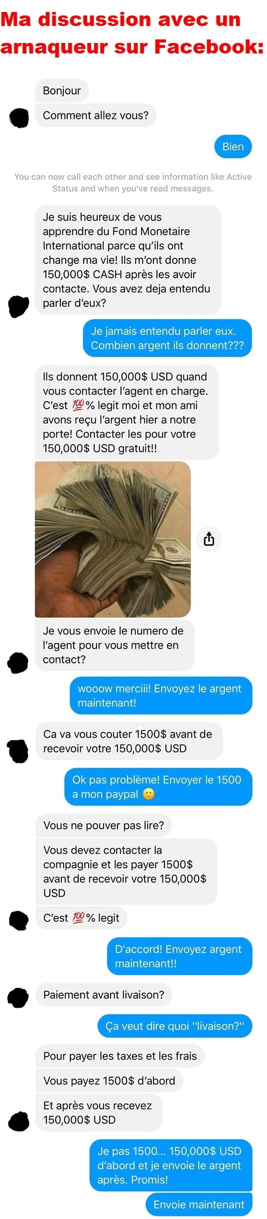 Blagues QuébécoisesMa discussion avec un arnaqueur sur Facebook 👇 FAIS RIRE QUELQU'UN Facebook 98 Messenger WhatsApp Pinterest0
