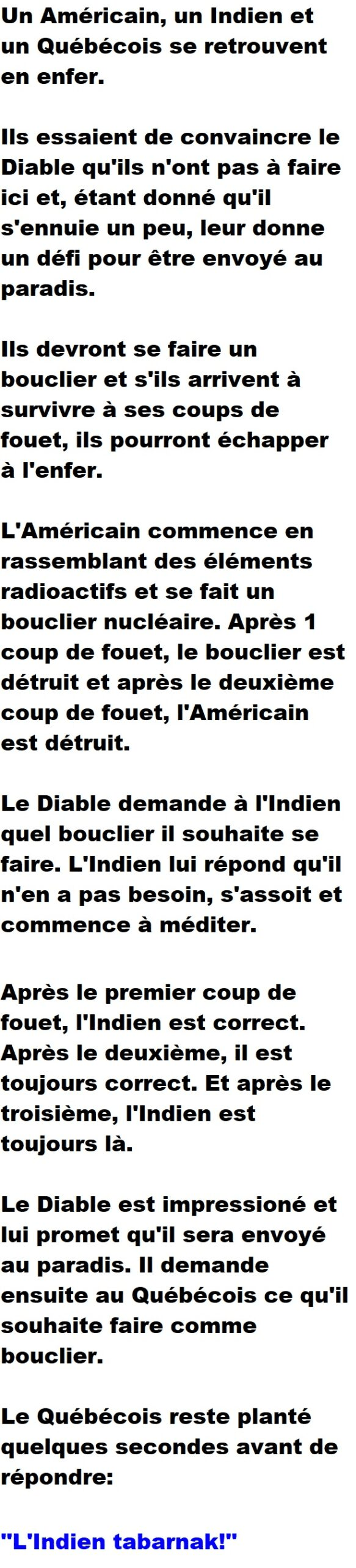 Blagues QuébécoisesUn Américain, un Indien et un Québécois arrivent en Enfer et font un deal avec le Diable 👇 FAIS RIRE QUELQU'UN Facebook 239 Messenger WhatsApp Pinterest0