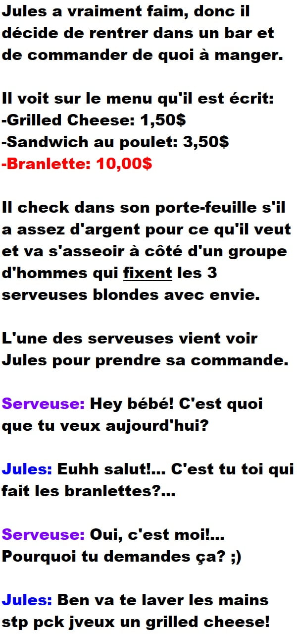 Blagues QuébécoisesJules rentre dans un bar où des br*nlettes sont sur le menu👇 FAIS RIRE QUELQU'UN Facebook 35 Messenger WhatsApp Pinterest0