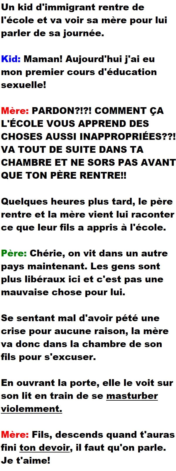 Blagues QuébécoisesUn kid d’immigrant a son premier cours d’éducation s*xuelle 👇 FAIS RIRE QUELQU'UN Facebook 515 Messenger WhatsApp Pinterest0