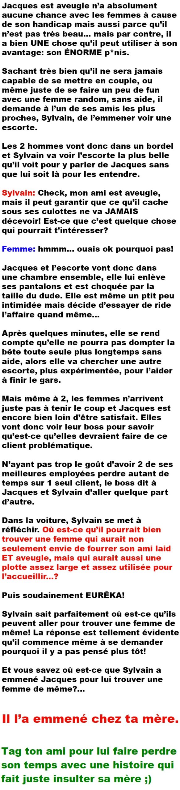 Blagues QuébécoisesJacques, un homme aveugle, est prêt à tout pour perdre sa virginité 👇 FAIS RIRE QUELQU'UN Facebook 52 Messenger WhatsApp Pinterest0