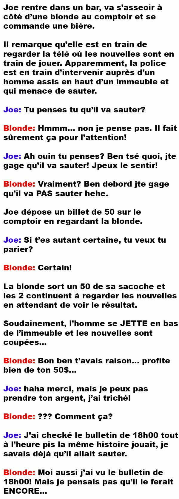 Blagues QuébécoisesJoe rentre dans un bar et fait un pari avec une blonde 👇 FAIS RIRE QUELQU'UN Facebook 1.9K+ Messenger WhatsApp Pinterest2