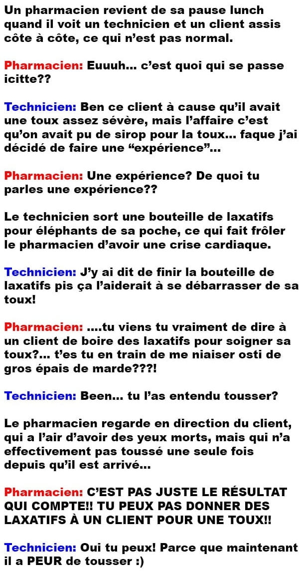 Blagues QuébécoisesUn pharmacien découvre que son technicien est un génie de la médecine 👇 FAIS RIRE QUELQU'UN Facebook 12 Messenger WhatsApp Pinterest0