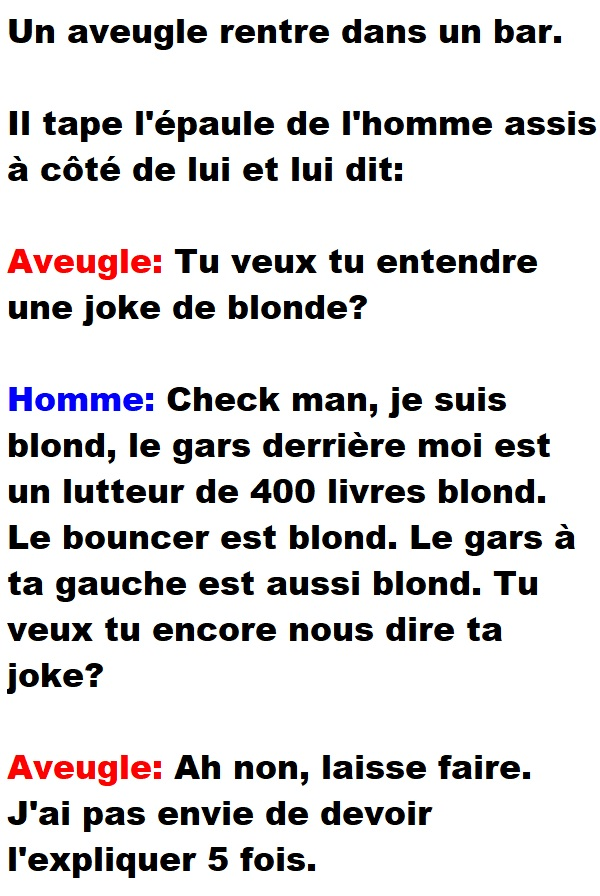 Blagues QuébécoisesUn aveugle rentre dans un bar et veut raconter une joke de blonde 👇 FAIS RIRE QUELQU'UN Facebook 801 Messenger WhatsApp Pinterest0