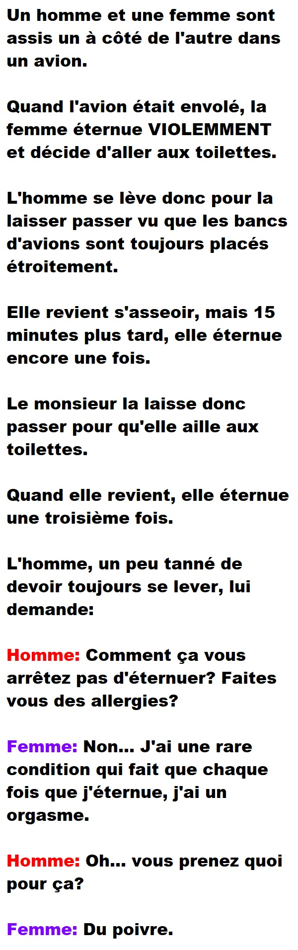 Home / Blagues Québécoises / Une femme arrête pas d’éternuer dans l’avion