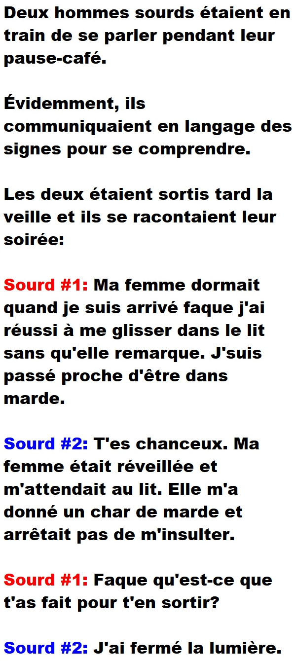 Blagues QuébécoisesDeux sourds se racontent leur soirée de la veille avec des signes 👇 FAIS RIRE QUELQU'UN Facebook 65 Messenger WhatsApp Pinterest0