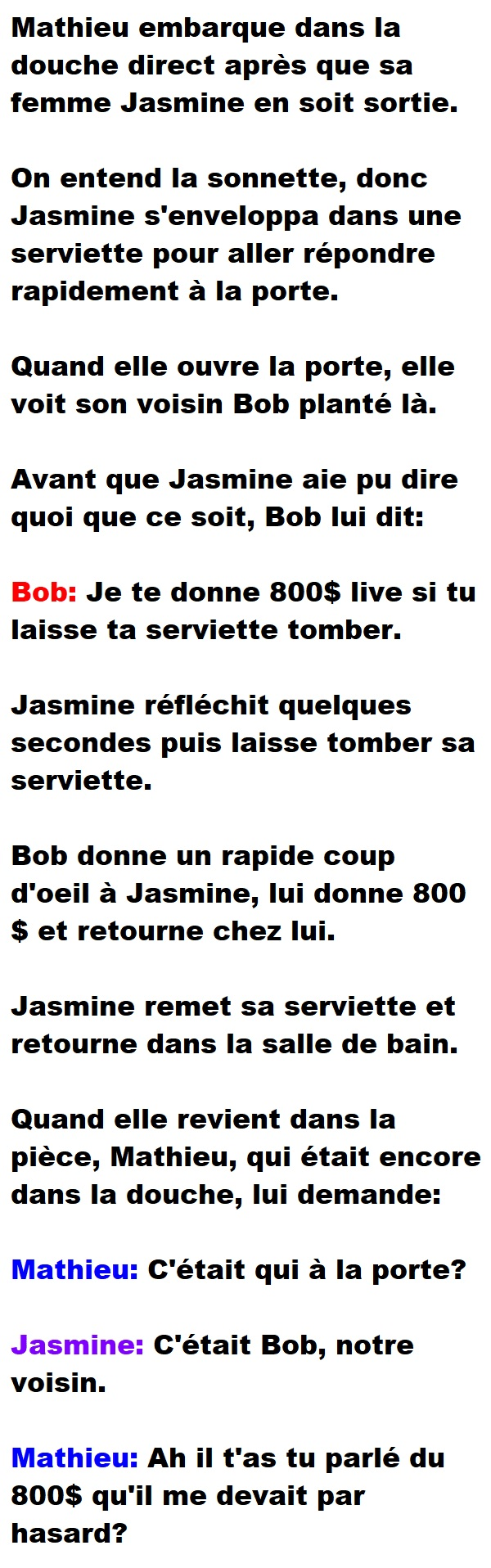 Blagues QuébécoisesJasmine se fait offrir 800$ pour enlever sa serviette de bain devant le voisin 👇 FAIS RIRE QUELQU'UN Facebook 56 Messenger WhatsApp Pinterest0