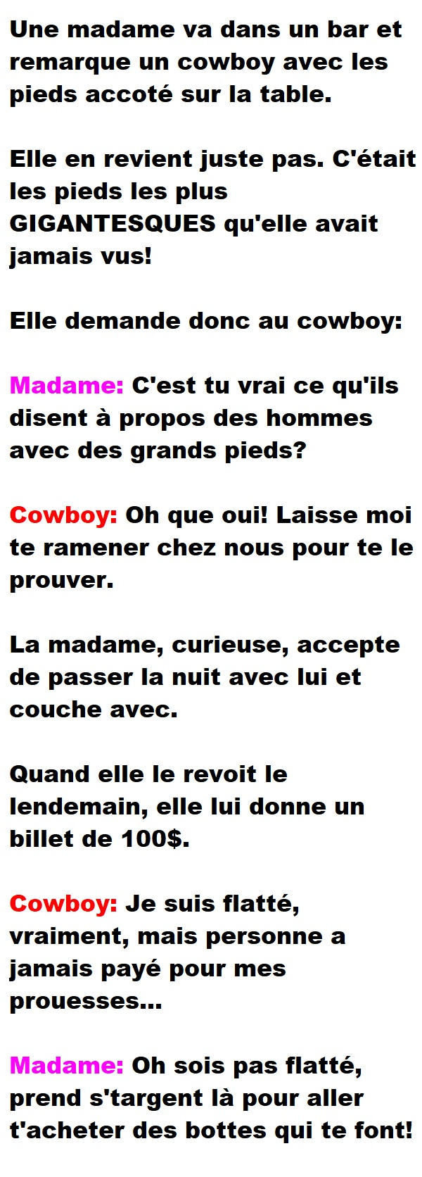 Blagues QuébécoisesUne femme passe la nuit avec un cowboy et ses bottes ÉNORMES 👇 FAIS RIRE QUELQU'UN Facebook 76 Messenger WhatsApp Pinterest0