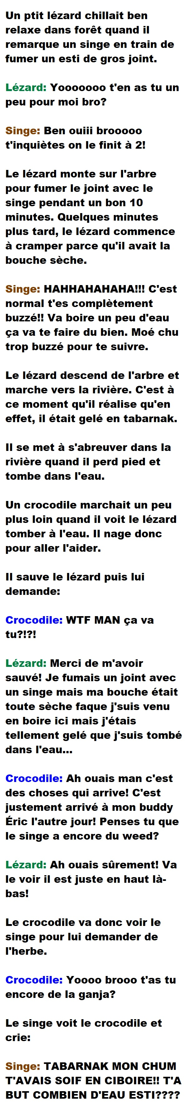 Blagues QuébécoisesUn lézard et un singe sont vraiment HIGH après avoir fumé un gros bat 👇 FAIS RIRE QUELQU'UN Facebook 94 Messenger WhatsApp Pinterest0