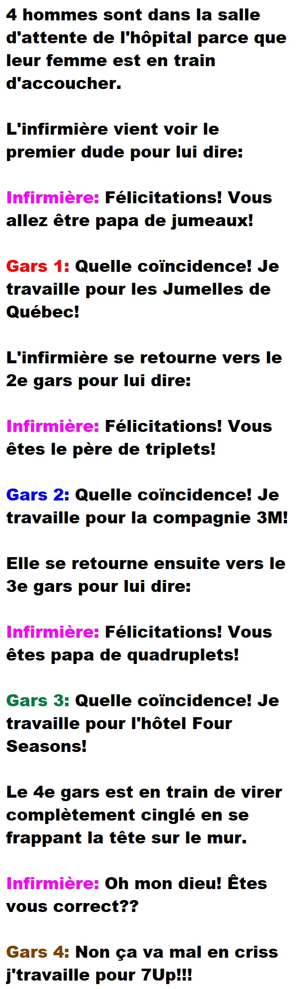 Blagues QuébécoisesQuatre dudes sont dans une salle d’attente pendant que leurs blondes accouchent 👇 FAIS RIRE QUELQU'UN Facebook 79 Messenger WhatsApp Pinterest0