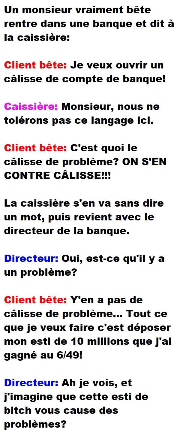 Blague de Cave, Blagues QuébécoisesUn client CRISSEMENT bête rentre à la banque pour s’ouvrir un compte 👇 FAIS RIRE QUELQU'UN Facebook 59 Messenger WhatsApp Pinterest0