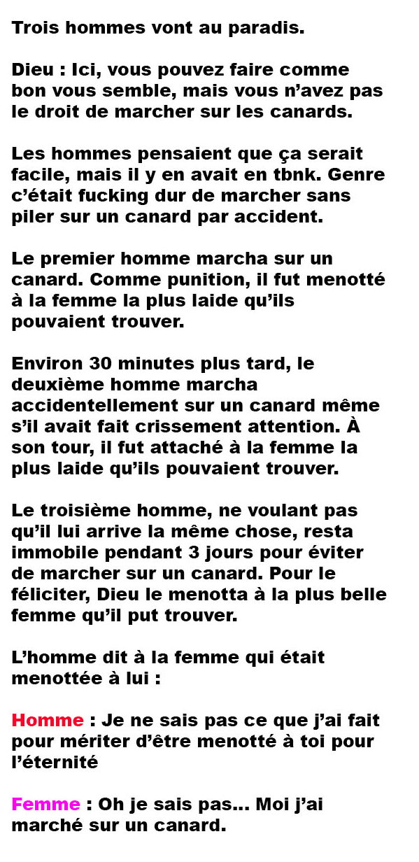 Blague de Religion, Blagues QuébécoisesTrois hommes vont au paradis et Dieu les laisse entrer à une seule condition 👇 FAIS RIRE QUELQU'UN Facebook 109 Messenger WhatsApp Pinterest0