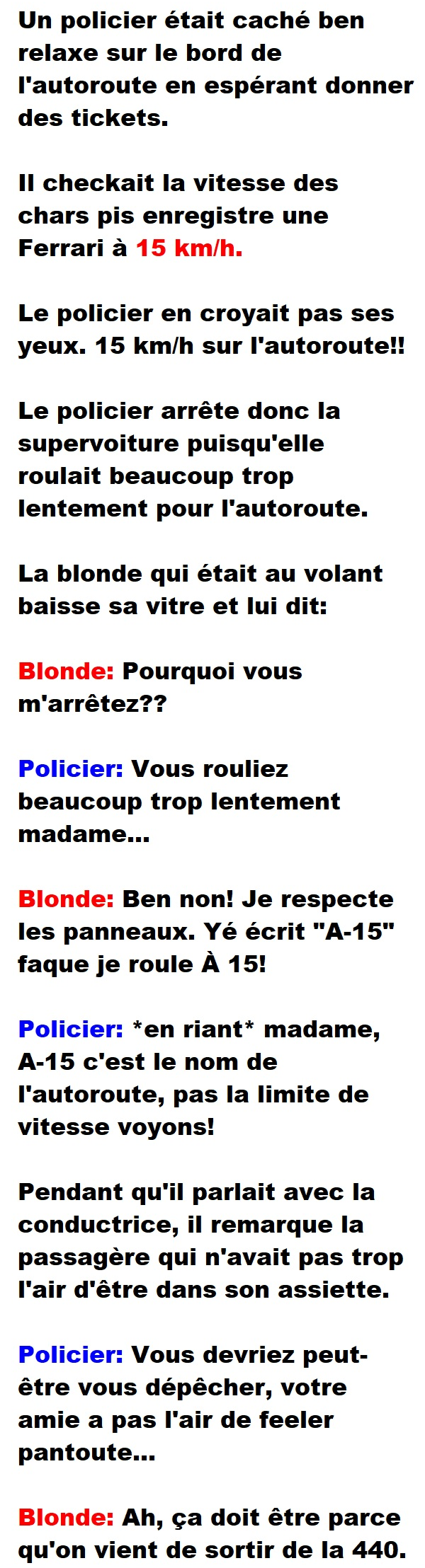 Blague de Blonde, Blagues QuébécoisesUn policier arrête une blonde en Ferrari… car elle était trop lente 👇 FAIS RIRE QUELQU'UN Facebook 52 Messenger WhatsApp Pinterest0