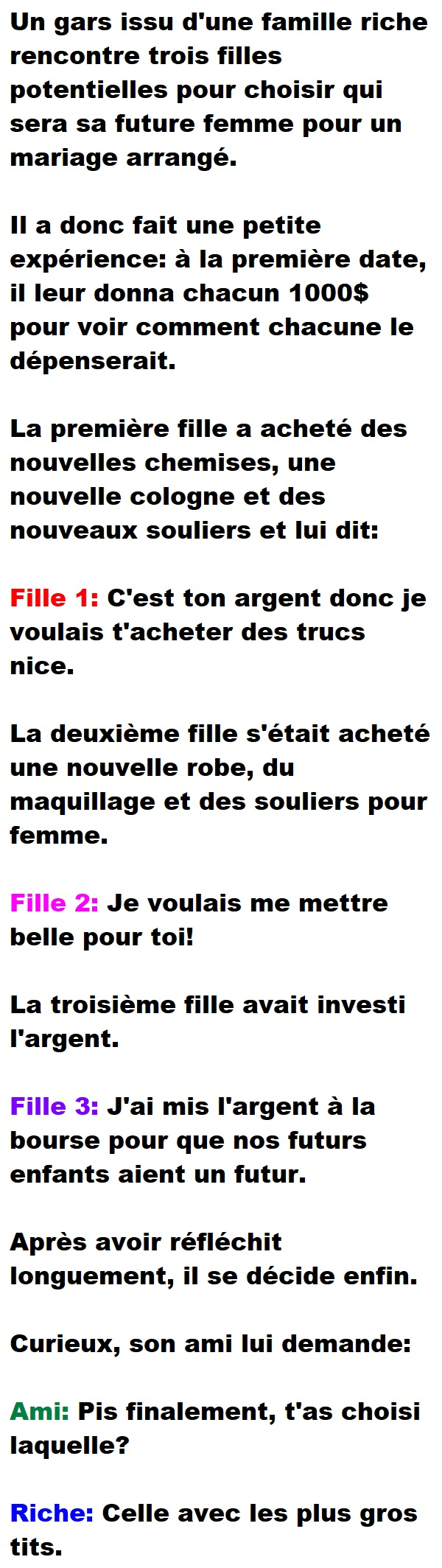 Blague de Couple, Blagues QuébécoisesUn gars d’une famille riche doit choisir la fille qu’il mariera 👇 FAIS RIRE QUELQU'UN Facebook 24 Messenger WhatsApp Pinterest0