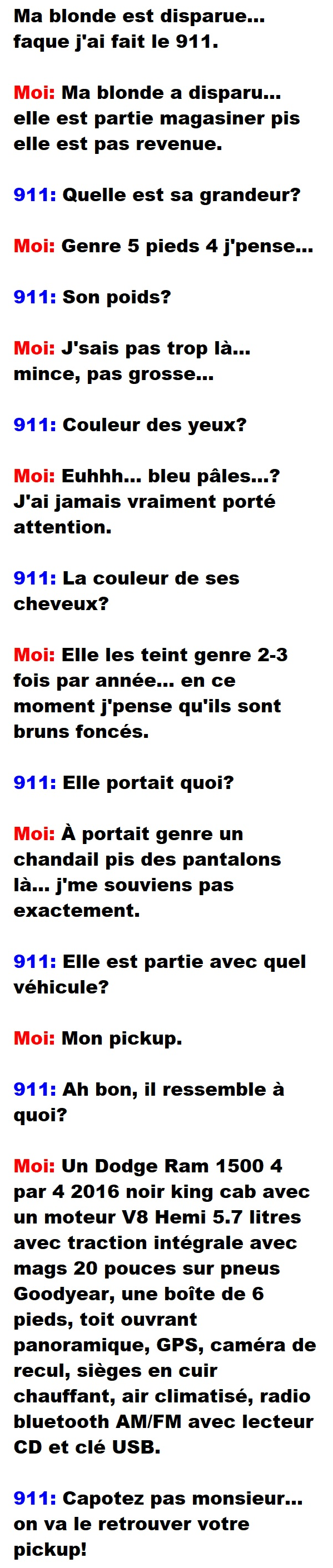 Blague de Police, Blagues QuébécoisesUn dude appelle le 911 après que sa blonde ait disparue 👇 FAIS RIRE QUELQU'UN Facebook 135 Messenger WhatsApp Pinterest0