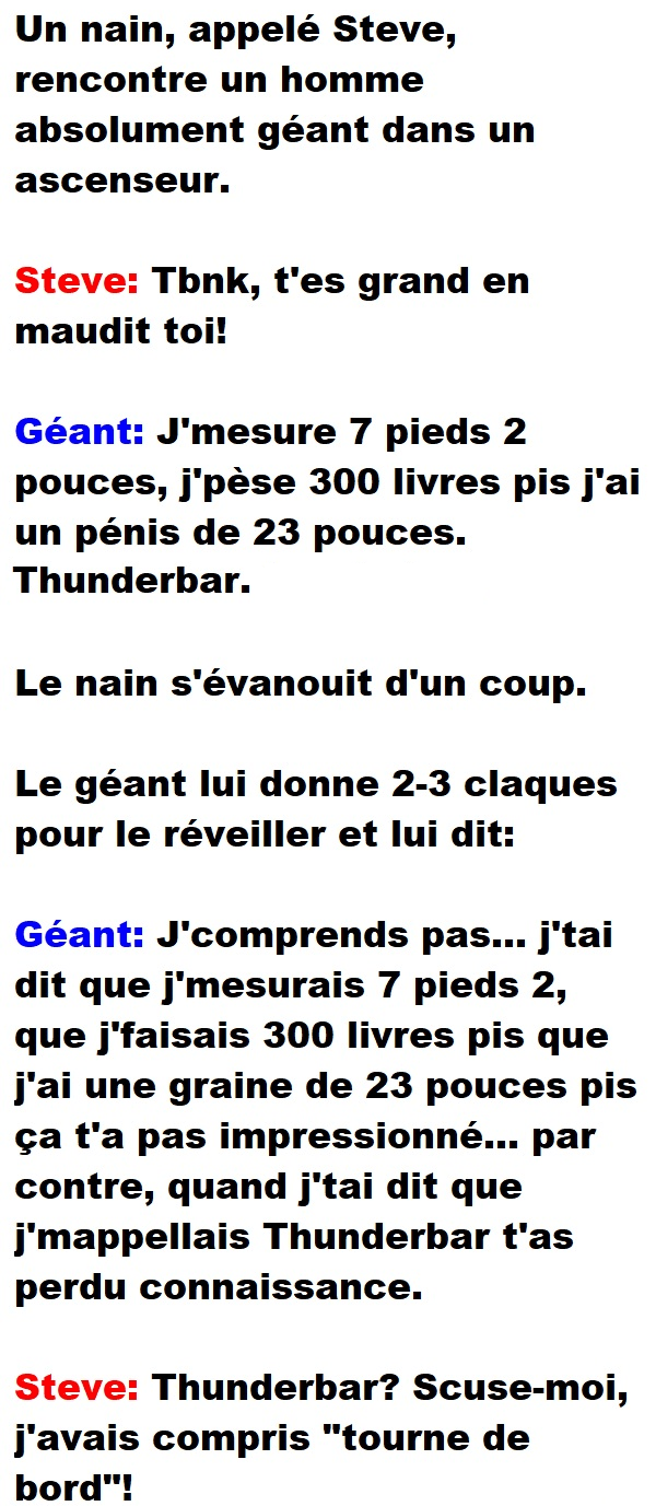 Blague de Cave, Blagues QuébécoisesUn nain rencontre un homme immense dans un ascenseur 👇 FAIS RIRE QUELQU'UN Facebook 774 Messenger WhatsApp Pinterest0