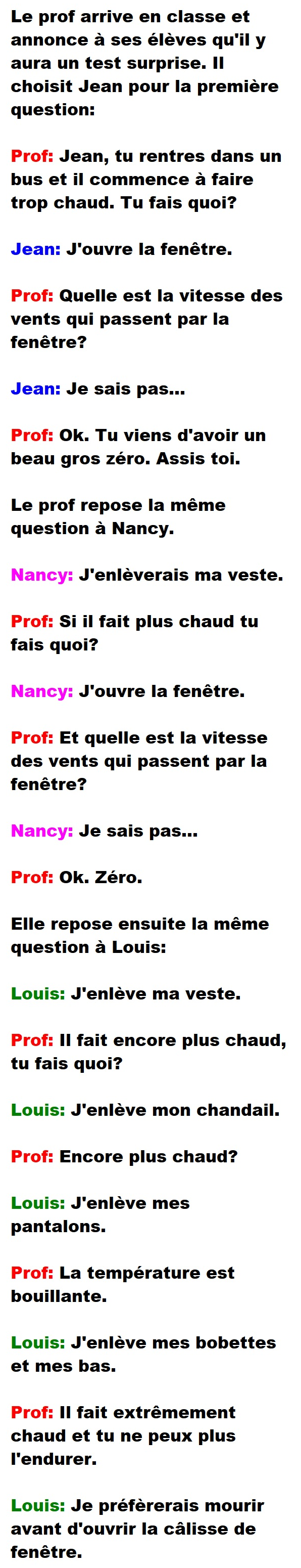 Blague de Prof, Blagues QuébécoisesUn prof fait un test surprise à ses élèves et donne zéro à tous ceux qui échouent 👇 FAIS RIRE QUELQU'UN Facebook 170 Messenger WhatsApp Pinterest0