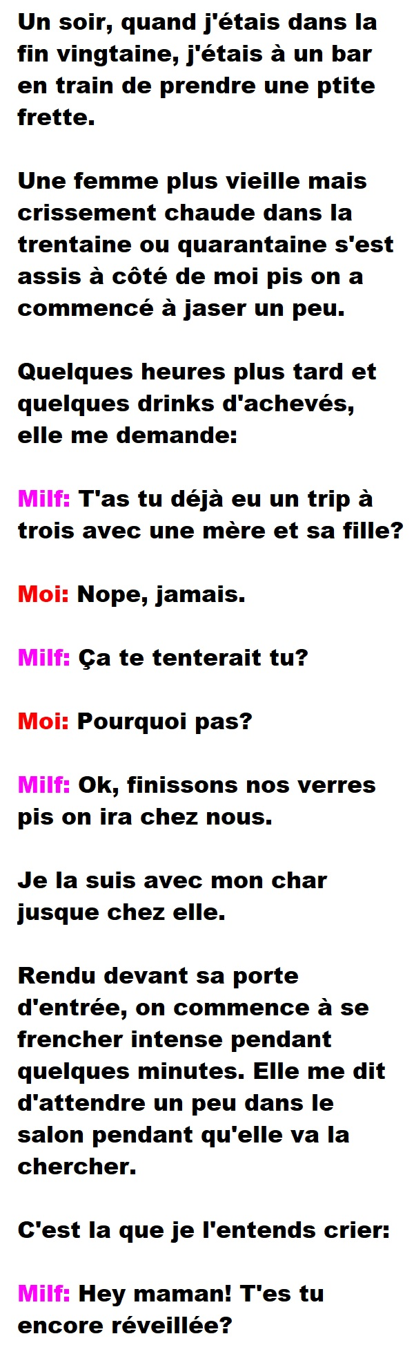 Blague Vulgaire, Blagues QuébécoisesUne MILF me demande si j’ai déjà fait un trip à trois avec une mère et sa fille 👇 FAIS RIRE QUELQU'UN Facebook 402 Messenger WhatsApp Pinterest0