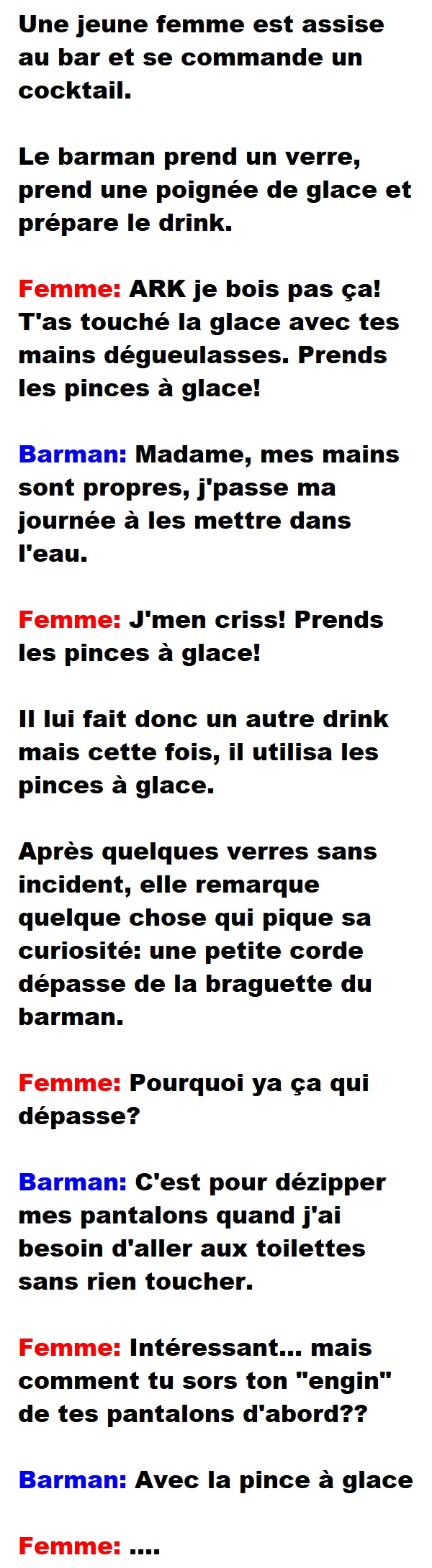 Blague de Bar, Blagues QuébécoisesUne jeune femme se commande un drink et se plaint que le barman est pas propre… 👇 FAIS RIRE QUELQU'UN Facebook 577 Messenger WhatsApp Pinterest0
