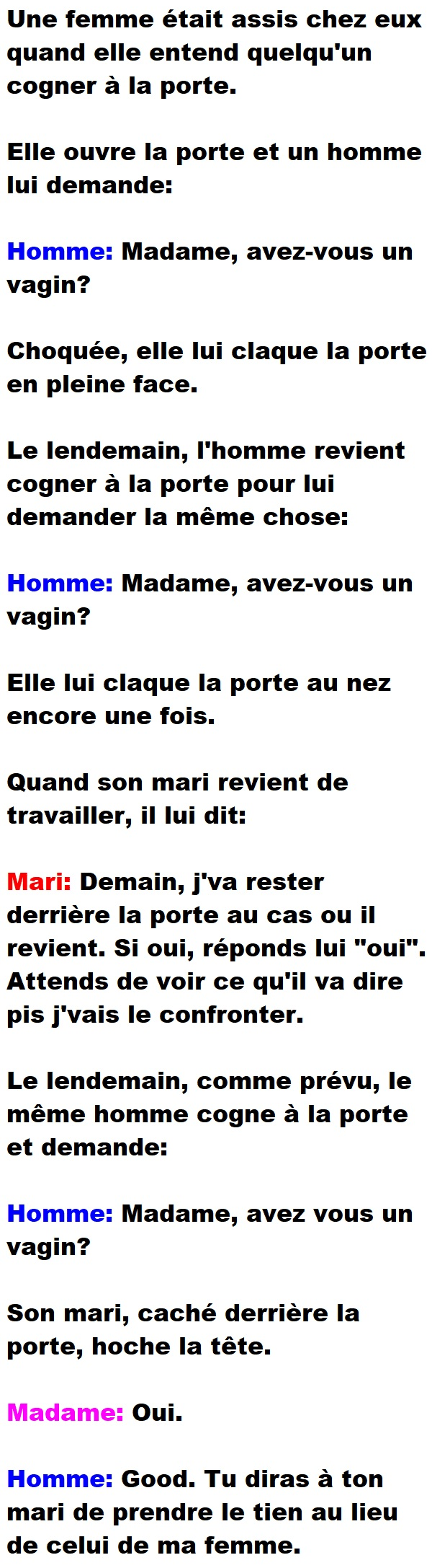 Blague Vulgaire, Blagues QuébécoisesUn homme cogne à la porte d’une femme pour lui demander si elle a un v*gin 👇 FAIS RIRE QUELQU'UN Facebook 120 Messenger WhatsApp Pinterest0
