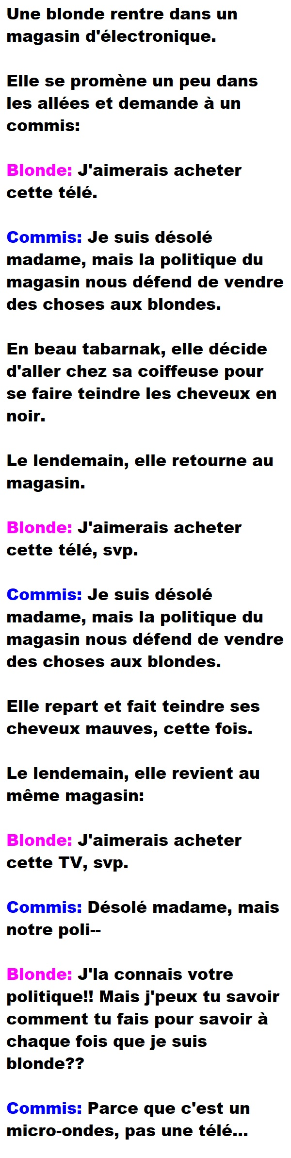 Blague de Blonde, Blagues QuébécoisesUn vendeur refuse de vendre une TV à une blonde 👇 FAIS RIRE QUELQU'UN Facebook 282 Messenger WhatsApp Pinterest0