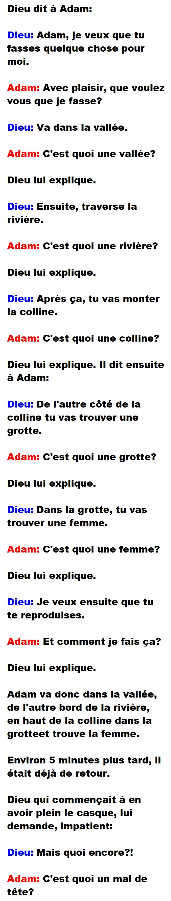 Blague de Religion, Blagues QuébécoisesDieu donne une mission à Adam 👇 FAIS RIRE QUELQU'UN Facebook 250 Messenger WhatsApp Pinterest0