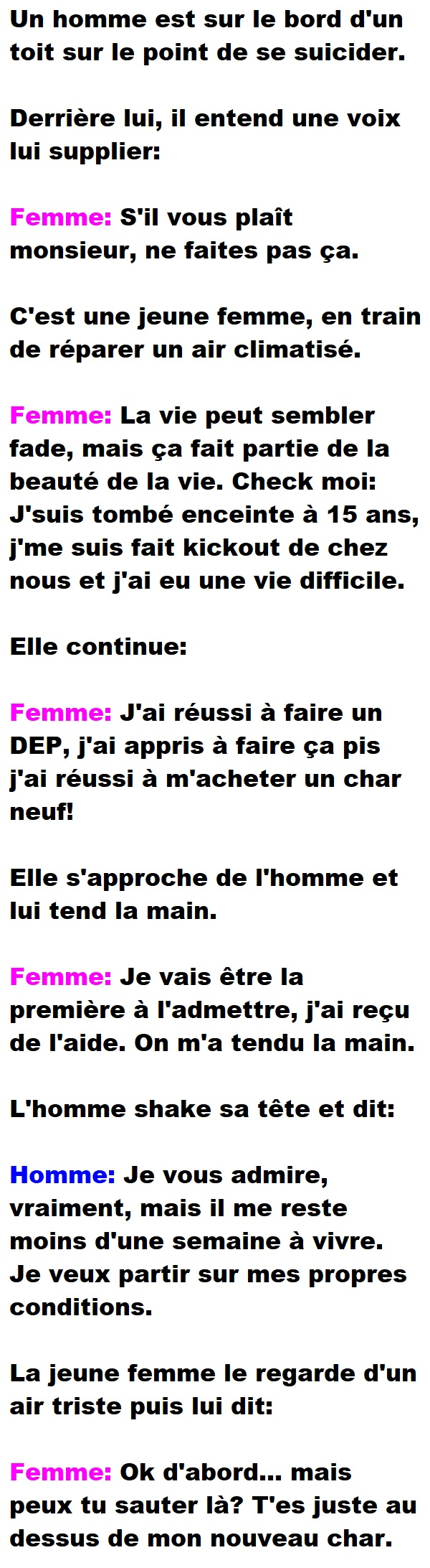 Blague de Cave, Blagues QuébécoisesUne femme essaie d’empêcher un homme de mettre fin à tout 👇 FAIS RIRE QUELQU'UN Facebook 97 Messenger WhatsApp Pinterest0