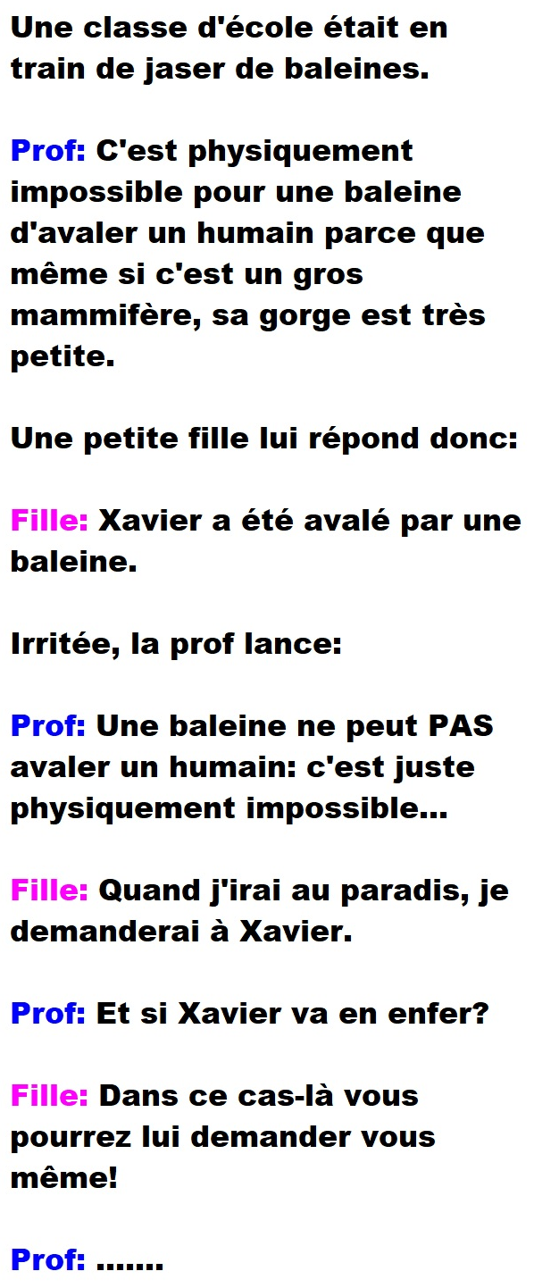 Blague d'Animal, Blagues QuébécoisesUn prof parle de baleines avec un élève qui fait son smatte 👇 FAIS RIRE QUELQU'UN Facebook 472 Messenger WhatsApp Pinterest0
