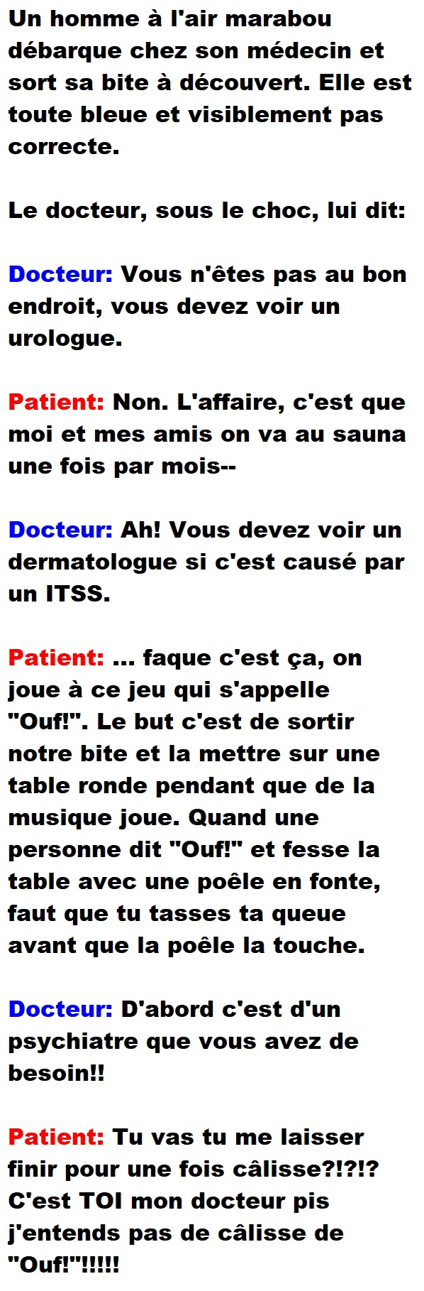 Un homme va voir son docteur parce que sa b*te est bleue..