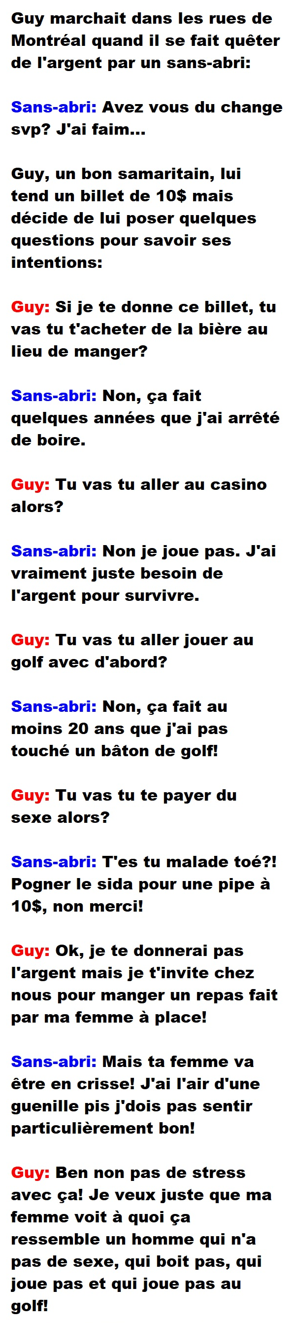 Blague de Cave, Blagues QuébécoisesGuy marchait à Montréal quand un sans-abri vient lui quêter de l’argent 👇 FAIS RIRE QUELQU'UN Facebook 202 Messenger WhatsApp Pinterest0