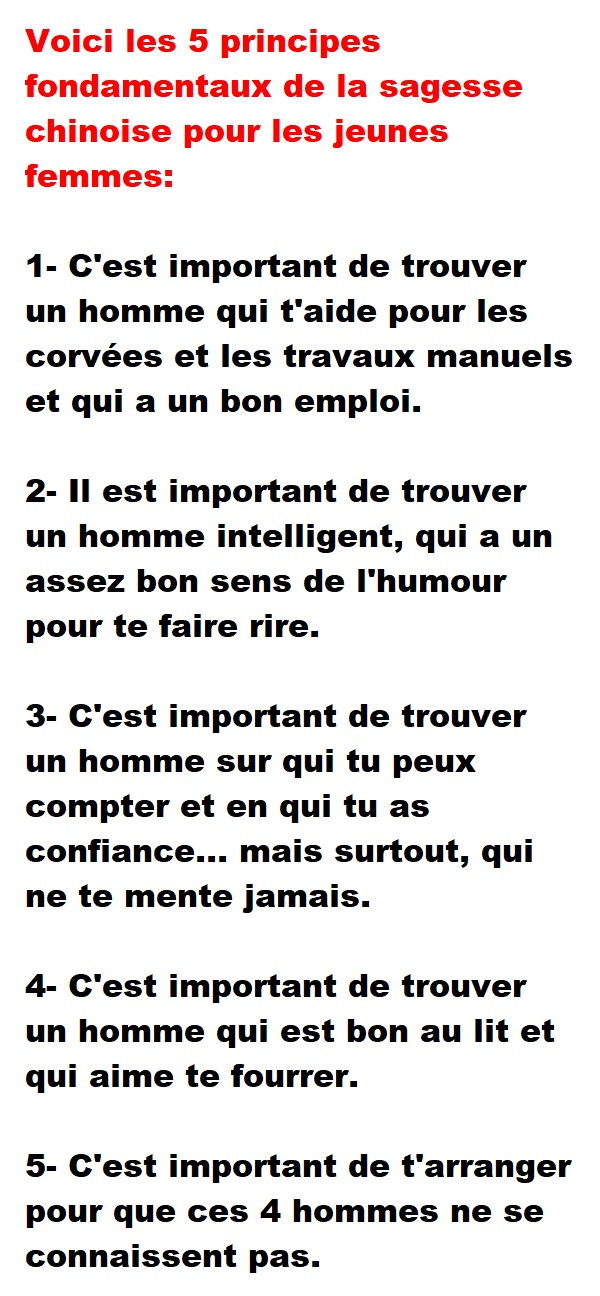 Home / Blagues Québécoises / Blague de Génie / Les 5 principes de la sagesse Chinoise pour les femmes qui souhaitent trouver L’AMOUR