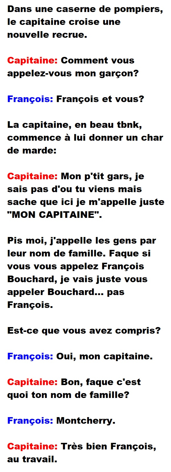 Blague de Cave, Blagues QuébécoisesLe capitaine d’une caserne de pompiers rencontre la nouvelle recrue, François 👇 FAIS RIRE QUELQU'UN Facebook 202 Messenger WhatsApp Pinterest0