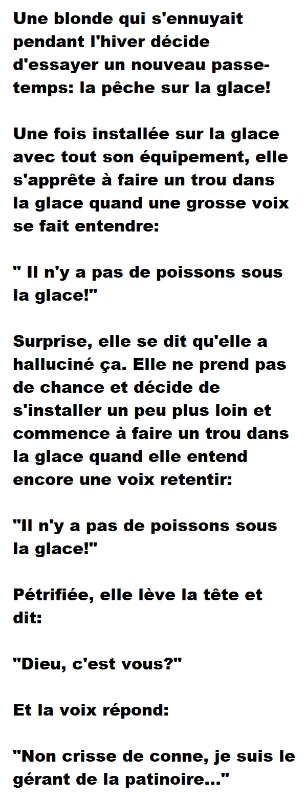 Blague de Blonde, Blagues QuébécoisesUne blonde qui s’ennuyait décide de faire de la pêche à la glace 👇 FAIS RIRE QUELQU'UN Facebook 239 Messenger WhatsApp Pinterest0