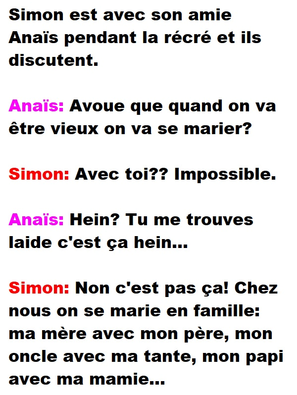 Home / Blagues Québécoises / Blague d'Enfant / Simon parle avec son amie Anaïs pendant la récréation