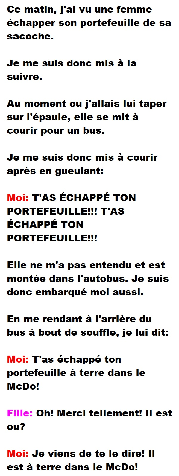 Blague de Cave, Blagues QuébécoisesJ’ai couru après une femme qui avait échappé son portefeuille… 👇 FAIS RIRE QUELQU'UN Facebook 84 Messenger WhatsApp Pinterest0