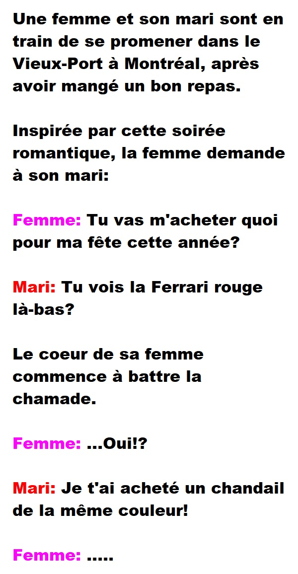 Home / Blagues Québécoises / Blague de Couple / Un gars se promène avec sa femme dans le Vieux-Port quand elle pose une question un peu indiscrète…