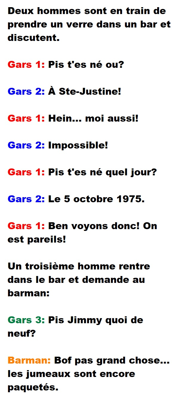 Blague de Bar, Blagues Québécoises2 hommes prennent un verre dans un bar et discutent de leur vie 👇 FAIS RIRE QUELQU'UN Facebook 118 Messenger WhatsApp Pinterest0