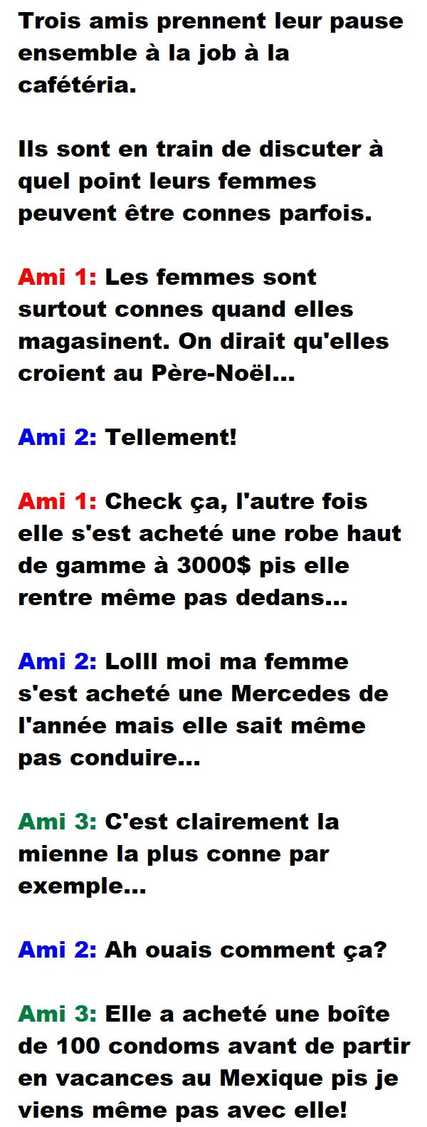 Blague de Cave, Blagues Québécoises3 amis discutent de la stupidité de leurs femmes pendant leur pause 👇 FAIS RIRE QUELQU'UN Facebook 70 Messenger WhatsApp Pinterest0