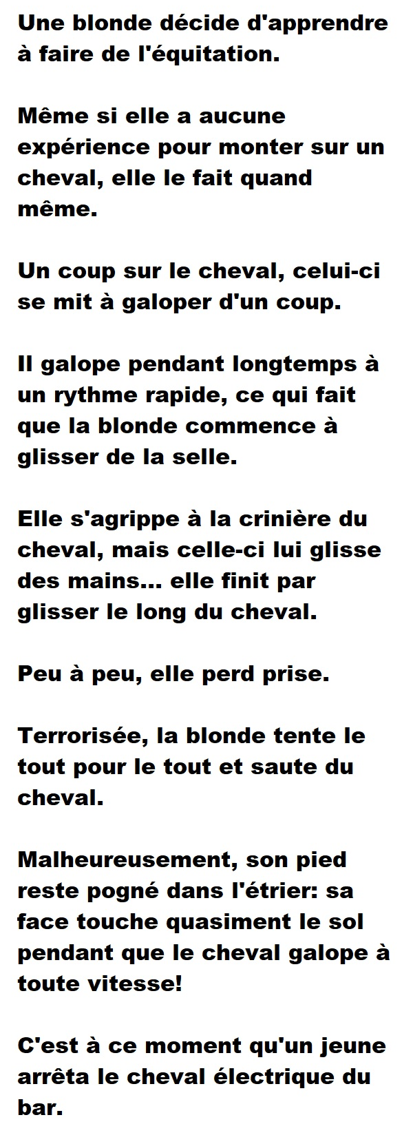 Blague de Blonde, Blagues QuébécoisesUne blonde décide de faire de l’équitation pour la première fois de sa vie 👇 FAIS RIRE QUELQU'UN Facebook 177 Messenger WhatsApp Pinterest0