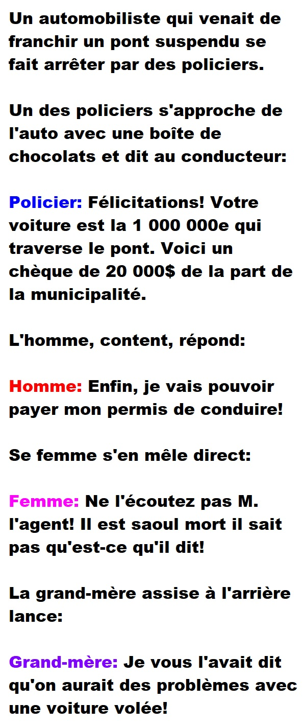 Home / Blagues Québécoises / Blague de Police / Une auto se fait arrêter par la police pour recevoir une “récompense”…